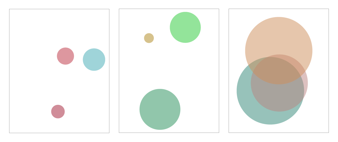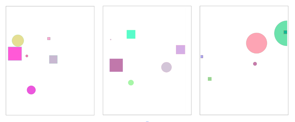 Since we are not defining all the properties that control how the shape will look on-screen (location, color, etc), Penrose will optimize and make those decisions for you. Therefore when you click the resample button, you will get a new diagram that might have varying appearances, and here we've provided some sample results of the same Penrose program. So do not worry if your diagram does not look the exact same as ours.