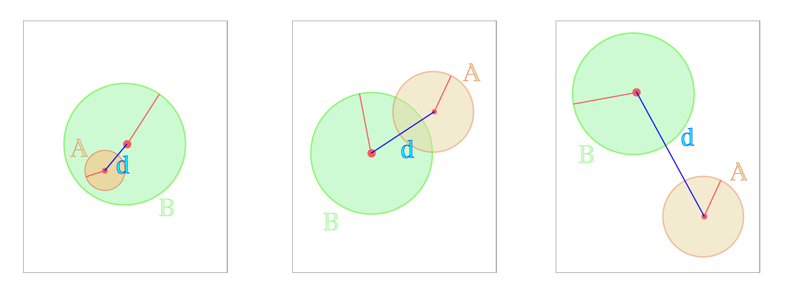Another piece of information we will be using is the distance $$d$$ between the radii. Notice how the distance gets progressively bigger as $$A$$ and $$B$$ become more disjoint. When $$A, B$$ are disjoint, we see that $$d$$'s value is the greatest.