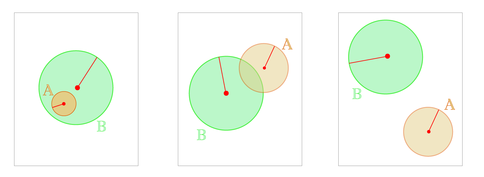 The three scenarios are visually obvious to us. We are shown 2 circles, and we can immediately identify their relationship. While Penrose does not have eyes, it speaks math! So, let's try looking at these circles a different way.